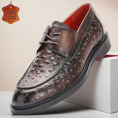 Sapatos derby masculinos de luxo, em couro genuíno marrom com textura de avestruz, modelo clássico com cadarço, ideais para homens de negócios, escritório, casamentos, banquetes e para um estilo refinado de cavalheiro.