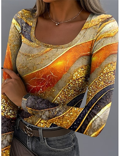 Camiseta Feminina T Shirt Com Decote Quadrado Canaletado Longo Casual Ombre Abstrato Vintage Estilosa Tops Regulares Diários Estampada Azul Azul Céu Laranja Marrom Verde Primavera Outono