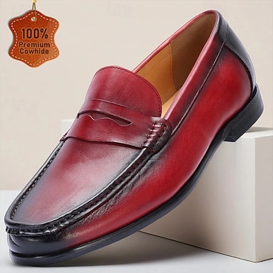 Mocassins masculinos de couro bordô com acabamento brilhante - calçado elegante e confortável para eventos formais, reuniões de negócios e ocasiões especiais.