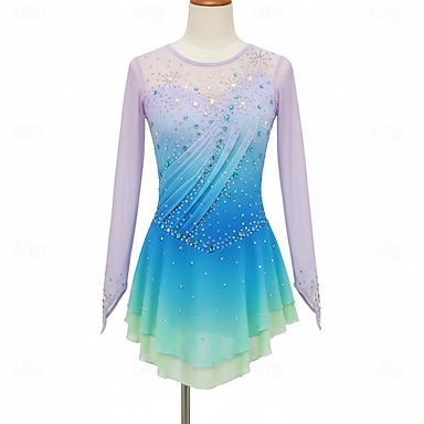 Vestidos para Patinação Artística Mulheres Para Meninas Patinação no Gelo Vestidos Azul+Azul Claro Thumbhole Detalhes e Estampas Elasticidade Alta Profissional Competição Roupa para Patinação Térmico
