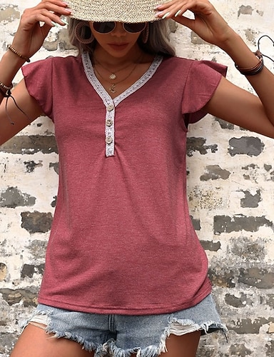 Mulheres Camiseta camiseta de um quarto de botão Renda Vintage à moda Casual Manga Curta Concha manga babado Decote V Tops regulares Diário Para Noite Rosa empoeirada Verão Primavera
