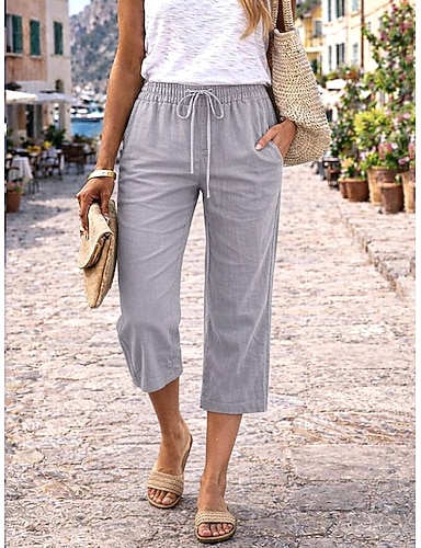 Mulheres Calças Capri Calças de linho de algodão chinês Shorts de verão Férias Básico Casual Comprimento da panturrilha Cintura Alta Tecido Bolsos Cintura elástica Confortável Conforto Macio Com