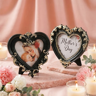 Moldura decorativa em resina preta e dourada em formato de coração para o Dia das Mães, pintada à mão, para exibir fotos, ideal para decoração de mesa, festas, hotéis, restaurantes, como acessório