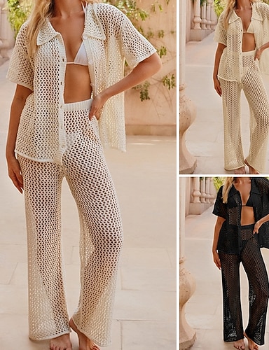 Mulheres Roupa de Banho Cobertura roupa de banho Renda Com Transparência Férias Roupa de Praia Côr Sólida Decote Redondo Manga Longa Fatos de banho