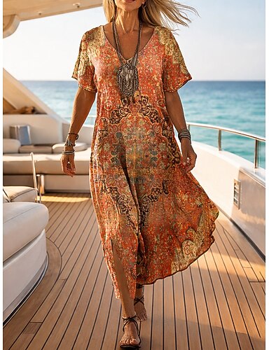 Mulheres Vestido Longo Vestidos Para o Verão Vestido T shirt Vestido A Line Férias Casual Praia Para Noite Ajuste Largo Floral Gráfico Tribal Manga Curta Decote V Rosa Roxo Laranja Verão Primavera