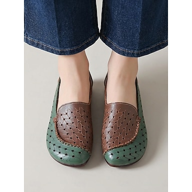 Sapatos femininos de salto baixo com blocos de cores verde e ferrugem, bico fino e salto baixo para encontros casuais e looks chiques do dia a dia