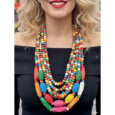 Colar Camadas de Pérolas de Madeira Multicolorido de Carnaval para Mulheres - Joias Boêmias de Declaração para Carnaval Festival e Máscaras