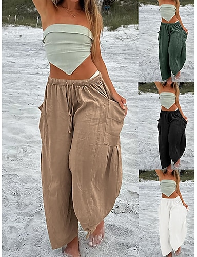 Mulheres Calças Calça verão Calças largas Calças de praia Férias Básico Comprimento total Cintura Média Côr Sólida Tecido Com Cordão Perna reta Conforto Macio Respirável Sem Elasticidade Diário Praia