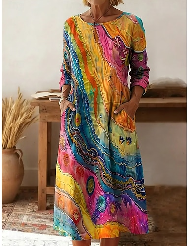 Mulheres Vestido midi Vestido da bainha Vestido T shirt Férias Casual Boho Feriado Encontro Normal Gráfico Geométrica Abstrato Manga Longa Gola Redonda Amarelo Rosa Laranja Verão Primavera
