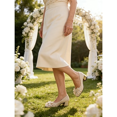Sapatos de casamento dourados champanhe com salto médio para a mãe da noiva – elegantes scarpins de salto bloco com detalhe de laço.