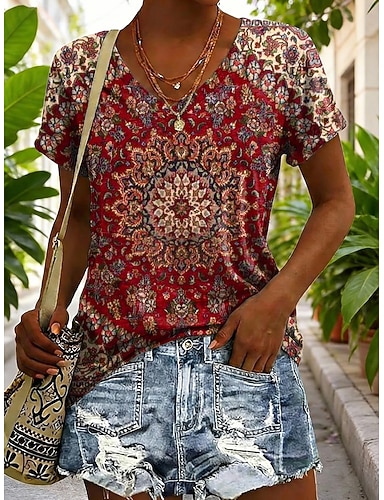 Mulheres Camiseta Imprimir Gráfico Geométrica Vintage à moda Clássico Manga Curta Decote V Tops longos Diário Vermelho Roxo Verão Primavera