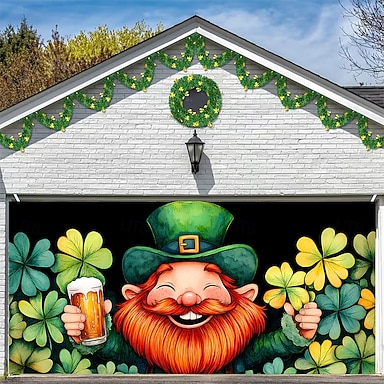Dia de São Patrício tapeçaria Tampa da porta da garagem Grande pendurado Elfo Animal Estilo bonito 3D De Festa Exterior Férias Fundos de fotografia Jarda Decoração de casa
