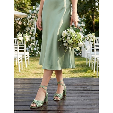 Sandálias femininas de salto bloco em cetim fúcsia, com detalhe de laço e tira no tornozelo, ideais para damas de honra em casamentos ao ar livre em jardins.