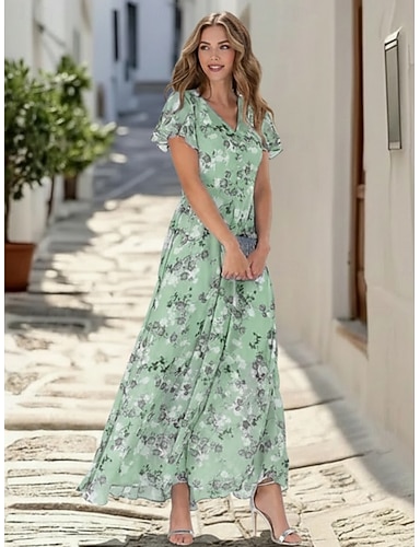 Mulheres Vestido Longo Vestido de chiffon Vestido Swing Vestido floral Vestido estampado Moda Moderno Ao ar livre Praia Férias Normal Floral Manga Curta Decote V Azul Verde Azul Claro Verão
