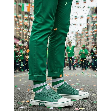Tênis masculino verde para o Dia de São Patrício – modelo slip-on estiloso com estampa festiva de trevo, perfeito para as comemorações do Dia de São Patrício.