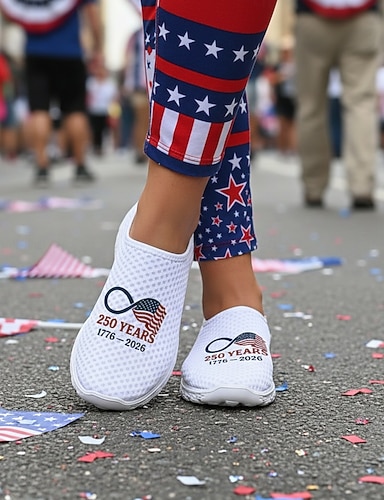 Sandálias femininas USA 250 com estampa patriótica de estrelas e listras, em lona, com sola acolchoada confortável, ideais para desfiles do Dia da Independência e festivais de verão. &celebrações ao