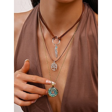 colar com pingente boêmio feminino em camadas, joia de três fios com pena, árvore da vida e pingente redondo vintage para festivais, festas e uso casual