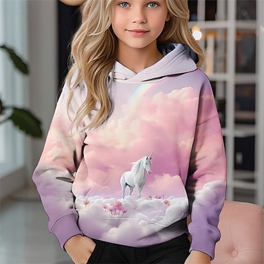 Para Meninas 3D Unicórnio Moletom Manga Longa Outono Inverno Moda Adorável Básico Infantil 4-12 anos Com Capuz Ao ar livre Casual Diário Normal