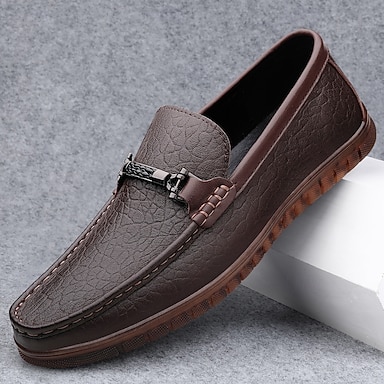 Mocassins masculinos de couro sintético marrom escuro, modelo clássico com textura de crocodilo, ideais para ocasiões formais e de negócios.