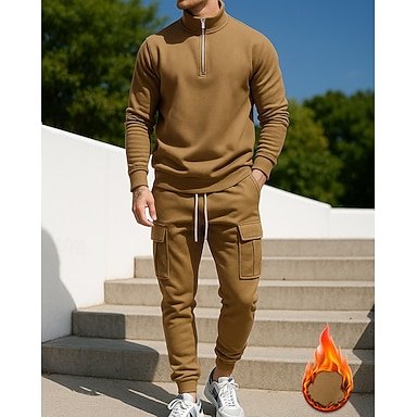 Homens Agasalho de 2 peças Conjuntos de moletom de lã Trajes de lazer Zíper de um quarto Cor Sólida Conjuntos Outono & inverno Preto Branco Exterior Viagem Esportivo Quente Folgado Manga Longa Esporte