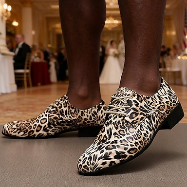 Sapatos sociais masculinos com estampa de leopardo, em couro sintético, estilosos e elegantes, perfeitos para casamentos, festas e ocasiões formais.
