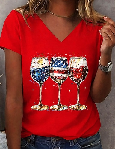 Dia da Independência Americana Mulheres Camiseta Imprimir Gráfico Bandeira à moda Clássico Casual Manga Curta Gola Redonda Tops regulares Casual Diário Azul Preto Verão Primavera