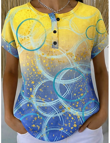 Mulheres Tops tricotados texturizados Camiseta Bloco de cor Âmbar Gráfico Geometria à moda Clássico Manga Curta Gola Redonda Decote Redondo Henley Tops regulares Diário Esportes Azul Amarelo Verde