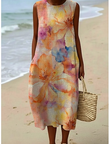 Mulheres Vestido midi Linho de algodão sintético Vestido de linho de algodão Moda Moderno Diário Ao ar livre Férias Normal Floral Meia Manga Gola Redonda Amarelo Laranja Azul Claro Verão Primavera