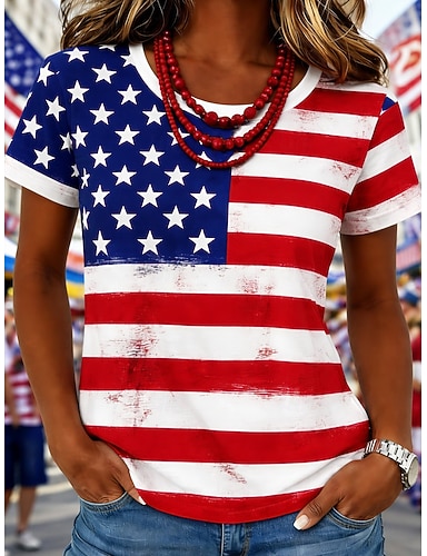 Dia da Independência Americana Mulheres Camiseta Imprimir Gráfico Letra Bandeira americana à moda Clássico Casual Manga Curta Gola Redonda Tops regulares Diário Vinho Vermelho Verão Primavera