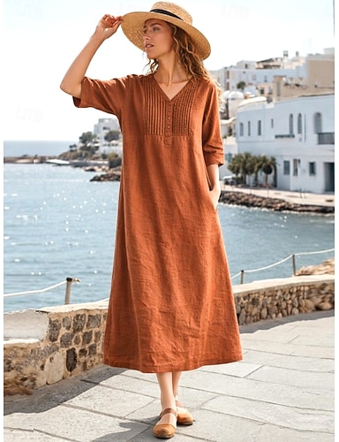 Mulheres Vestido midi Linho de algodão sintético Vestido de turno Casual Diário Ajuste Largo Tecido Manga 3/4 Decote V Laranja Verão Primavera Outono