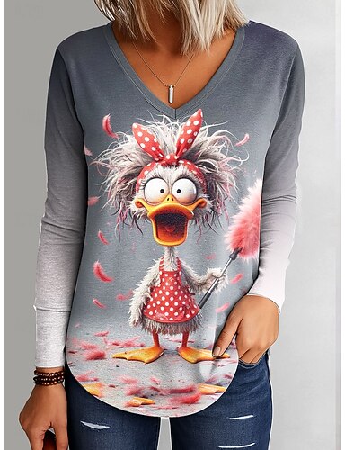 Mulheres Camiseta Imprimir Âmbar Gráfico Pato Vintage à moda Clássico Manga Longa Decote V Tops regulares Diário Azul Roxo Verde Cinzento Primavera Outono Inverno