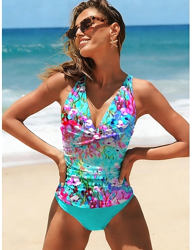 Mulheres Roupa de Banho Uma pedaço 2 partes Monoquíni roupa de banho Compressão abdominal Cintura Alta Delgado Frente Única Férias Roupa de Praia Floral Pescoço Assimétrico Sem Manga Fatos de banho
