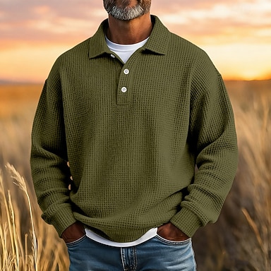 Homens Camisas Polo Waffle Textura Casual Férias Aberto para a Lateral Manga Longa Moda Côr Sólida Tecido Botões Puro Outono Primavera & Outono Normal Preto Verde Claro Verde Azul Claro Roxo Azul