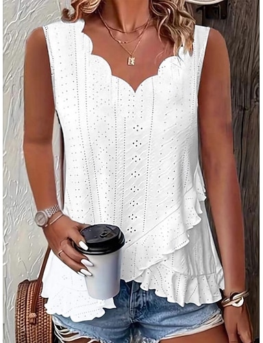 Mulheres Blusa Textura Topo de ilhó Camiseta Pointelle Malha Íntima Frufru Ilhó Côr Sólida à moda Casual Sem Manga Decote V Tops regulares Casual Diário Praia Azul Branco Amarelo Rosa Verde Verão