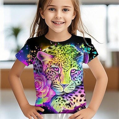 Camiseta feminina neon arco-íris leopardo por sheena pike, estampa 3d de leopardo, manga curta, moda verão primavera, básica, infantil, 4 a 12 anos, gola redonda, casual para atividades ao ar livre,