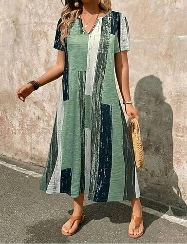 Mulheres Vestido midi Vestidos de algodão e linho Vestido de turno Vestido casual Moda Moderno Diário Ao ar livre Férias Ajuste Largo Geométrica Manga Curta Decote V Marron Verde Verão Primavera