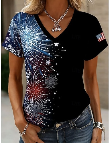 Dia da Independência Americana Mulheres Camiseta Imprimir Gráfico Bandeira Vintage à moda Clássico Manga Curta Decote V Tops regulares Diário Azul Preto Verão Primavera