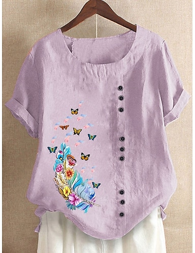 Mulheres Blusa Botões Imprimir Gráfico Borboleta Vintage Casual Manga Curta Gola Redonda Tops regulares Diário Para Noite Castanho Avermelhado Branco Rosa Roxo Verão Primavera
