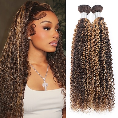 2 pacotes de cabelo humano com mechas p4/27, ondulado e cacheado, de 10 a 28 polegadas.