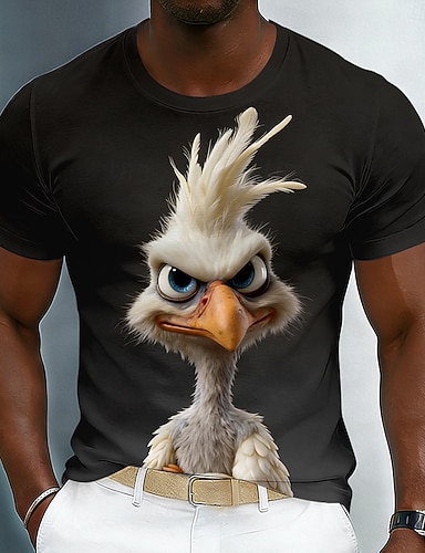 Camiseta masculina divertida com estampa de pássaro em estilo de animação gráfica 3D, personagem animado por computador, camiseta casual preta de manga curta e gola redonda, design peculiar e