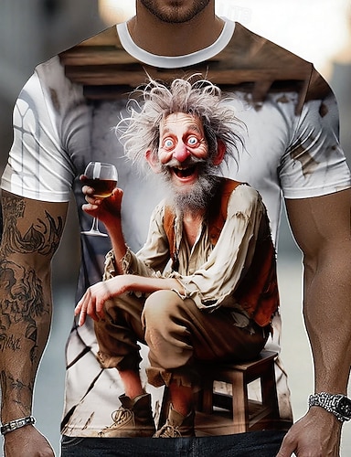 Camiseta masculina engraçada com um velho maluco segurando uma taça de vinho, personagem peculiar e divertido, estilo animação 3D, estampa por toda a peça, casual, manga curta, para festas e bares,
