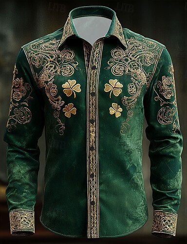 Camisa de Arte Céltica Trevo de Quatro Folhas do Dia de São Patrício Masculina Camisa de Botão Manga Longa Vintage Retro Feriado Primavera Outono Camisa de Linho Imitação Impressão 3D Verde 1 Verde