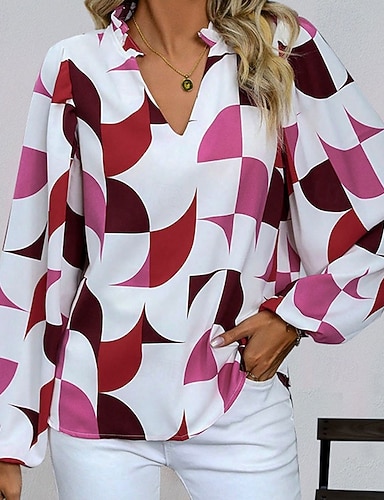Mulheres Camisa Social Com Pregas Geométrica Tecido Elegante senhoras à moda Manga Longa Manga lanterna Decote V Tops regulares Diário Trabalho Para Noite Preto Vinho Primavera Outono