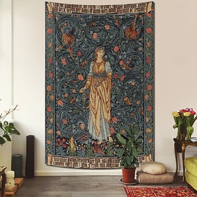 Tapeçaria de parede Flora estilo William Morris, Serva da Terra: Eu sou a serva da Terra, eu bordo seu belo vestido glorioso, arte de deusa vitoriana para pendurar na parede, decoração para sala de