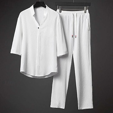 Homens Camisa de colarinho de banda 2 Peças Conjunto de camisa Conjunto de verão Conjuntos correspondentes Roupa de Praia Preto Branco Cinzento Meia Manga Cor Sólida Colarinho Ao ar livre Rua Com