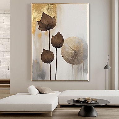 Pintura botânica texturizada em tela, feita à mão, com vagem de lótus murcha, representando uma obra de arte natural com folhas de lótus murchas e botão de flor.
