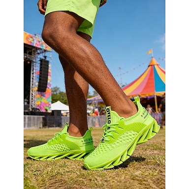 Tênis masculino verde neon com solado grosso, respirável, modelo slip-on, ideal para festivais de música, shows, streetwear, eventos ao ar livre, festas e para quem busca um estilo ousado e marcante.