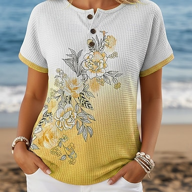 Mulheres Camiseta Imprimir Botões no peito impressão de mármore à moda Moderno Casual Manga Curta Henley Tops regulares Diário Azul Amarelo Roxo Verde Verão Primavera