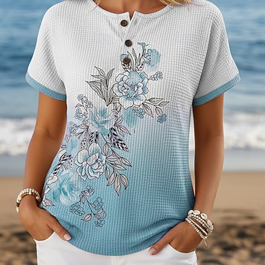 Mulheres Camiseta Imprimir Botões no peito impressão de mármore à moda Moderno Casual Manga Curta Henley Tops regulares Diário Azul Verão Primavera