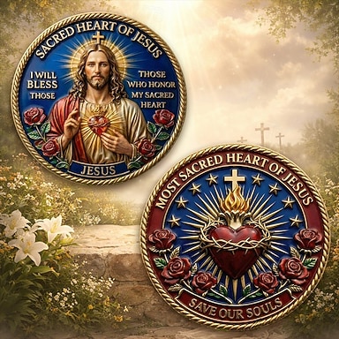 Moeda comemorativa do Sagrado Coração de Jesus, em homenagem à devoção e à fé; medalha cristã colecionável inspiradora; presente religioso para oração e reflexão devocional.